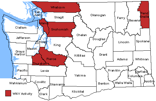 SampleIsland 0 1 0 0 Pend Orielle 0 0 1 0 Pierce 0 0 1 0 Snohomish 0 0 1 0 Thurston 0 0 1 0 Whatcom 0 1 0 0 Totals 0 2 4 0 Table represents in-state acquired West Nile virus human cases, and cases are listed by county of residence.
