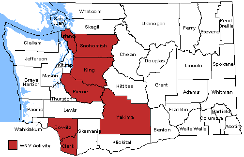 SampleClark 1 0 0 0 Cowlitz 0 0 1 0 Island 0 0 1 0 King 0 1 6 0 Pierce 2 0 0 0 Snohomish 0 0 2 0 Yakima 0 5 3 0 Totals 3 6 13 0 Table represents in-state acquired West Nile virus human cases, and cases are listed by county of residence.