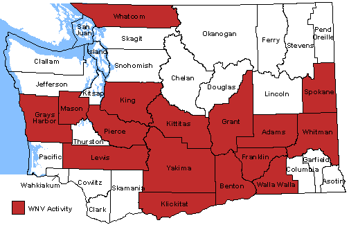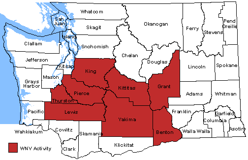 SampleAdam 0 2 0 3 Benton 9 23 7 128 Franklin 0 3 2 45 Grant 1 11 0 10 Grays Harbor 0 0 1 0 King* 1 0 2 0 Kittitas 0 16 2 2 Klickitat 2 0 0 3 Lewis 0 0 1 0 Mason 0 0 1 0 Pierce 0 0 1 0 Spokane** 2 0 1 0 Walla Walla 0 0 4 1 Whatcom* 1 0 0 0 Whitman 1 0 0 0 Yakima 21 18 0 154 Totals 38 73 22 346 Table represents in-state acquired West Nile virus human cases, and cases are listed by county of residence. *Exposures in eastern Washington. ** Exposures potentially in county of residence or in other eastern Washington counties.