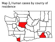 Likely ExposureBy County of Residence Benton 0 0 0 0 9 Franklin 0 0 0 0 1 Grant 0 0 1 0 29 King 1 1 0 0 0 Pierce 0 0 0 0 4 Spokane 0 0 0 0 3 Stevens 0 0 1 0 0 Thurston 0 1 0 0 0 Whatcom 0 1 0 0 0 Yakima 0 0 0 0 3 Multi-county Exposure* 0 In-state Acquired 1 Out-of-state Acquired 2 Totals 3 2 0 49 * "Multi-county Exposure" represents human cases that had potential exposure in more than one county. These cases are not shown on Map 1. Human Cases by County of Likely Exposure.