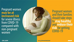 Pregnant people may be at greater risk for severe illness from COVID-19 and should do what they can to stay healthy and avoid getting COVID-19. Pregnant women and their families should take steps to stay healthy and reduce their risk for getting COVID-19.
