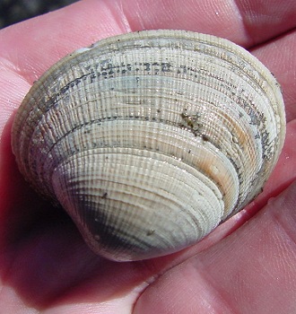 Shell: Concentric rings. No radiating ridge lines. Yellow to grey/white colored.