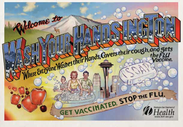 The Washington State Department of Health welcomes you to WashYourHandsingTon! Where everyone washes their hands, covers their coughs and gets the flu vaccine! Get vaccinated. Stop the flu.