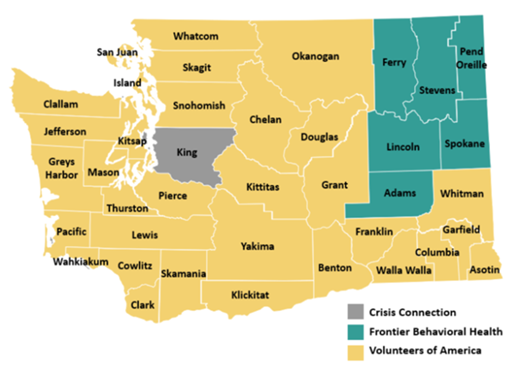 រដ្ឋវ៉ាស៊ីនតោនមានមជ្ឈមណ្ឌលដោះស្រាយវិបត្តិ 988 Lifeline ចំនួនបីដែលទទួលទូរសព្ទ សារជាអក្សរ និងសារជជែកពីជុំវិញរដ្ឋ៖
