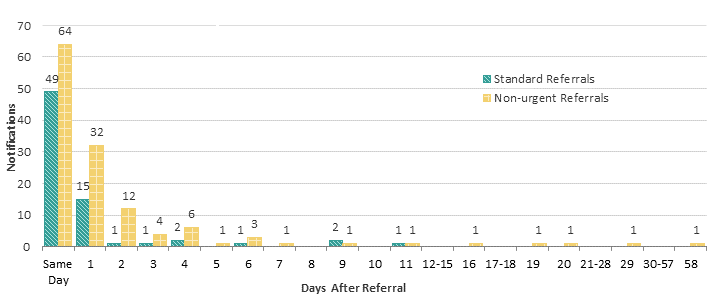 For non-urgent referrals, 61.3% of the required notifications were reported to the department. Of the reported notifications, 83.1% reported that parents were notified within three days of the referral.