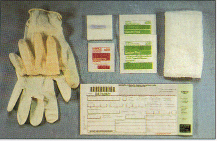 Equipment needed: sterile lancet with tip less than 2.4mm, sterile alcohol prep, sterile gauze pads, soft cloth, blood collection form, and gloves. |