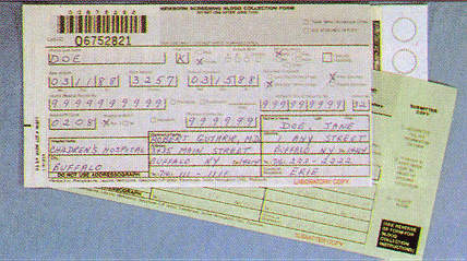 Complete ALL information. Do not contaminate filter paper circles by allowing the circles to come in contact with spillage or by touching before or after blood collection. Keep "SUBMITTER COPY" if applicable. |