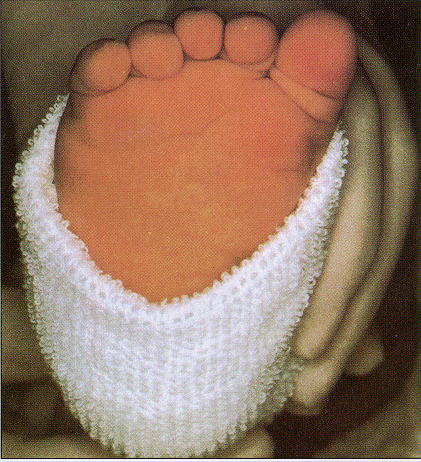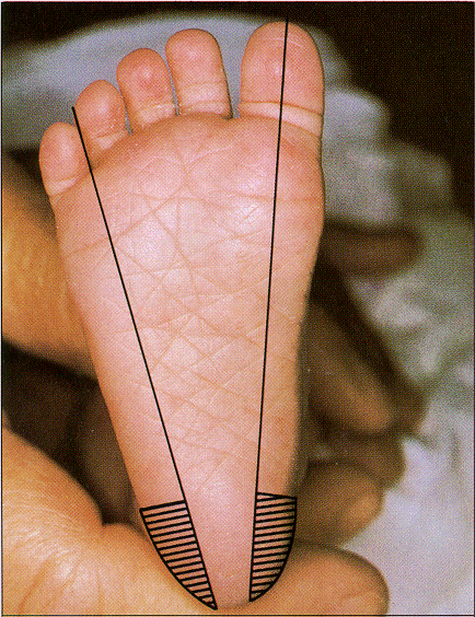 Puncture heel. Wipe away first blood drop with sterile gauze pad. Allow another LARGE blood drop to form. |