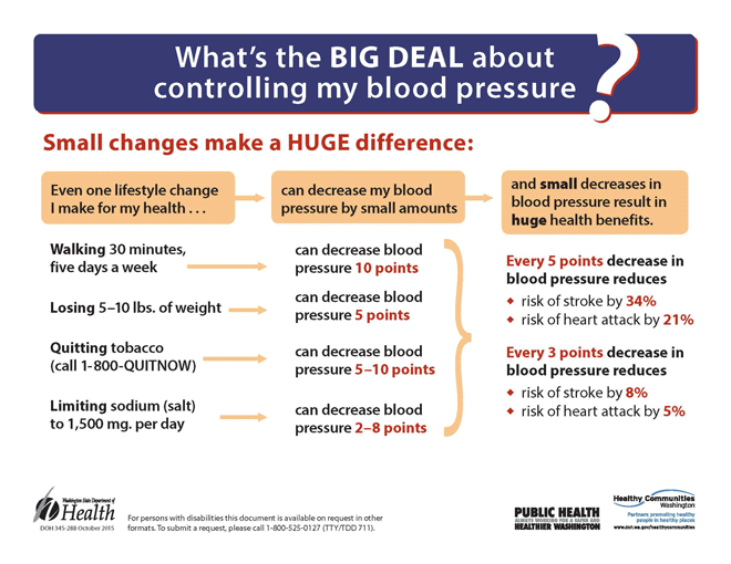 Small decreases in blood pressure can really help your heart. Every five point decrease in blood pressure reduces your risk of heart attack by 21%.