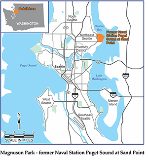 Cleanup of low-level radiation in and around Buildings 2 and 27 at Seattle's Magnuson Park finished at the end of May 2015. The U.S. Navy and Seattle Parks will continue to research, assess, and test other areas of the park to make sure these areas were the only ones with radiation contamination. More information about these projects is available from the Washington State Department of Ecology.