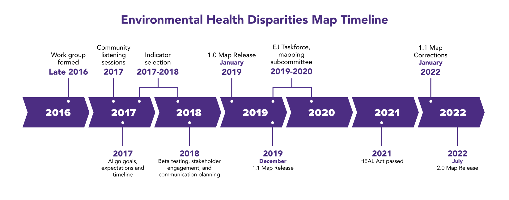 Since the map was published in January 2019, several Washington laws and rules highlight it as a resource. The HEAL Act, passed in 2021, led to the first dedicated, ongoing state funding to maintain and update the EHD map. The HEAL Act (RCW 43.70.815) requires DOH to: