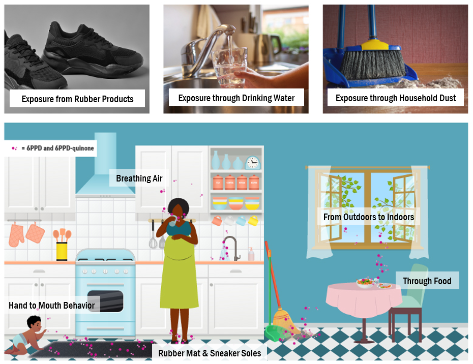 6PPD can be added to rubber products other than tires, such as floor mats and sneaker soles. As these products wear down, the small particles of rubber can potentially contribute 6PPD and 6PPD-quinone to indoor dust. We are still learning whether dust exposure to these chemicals is a concern for health.